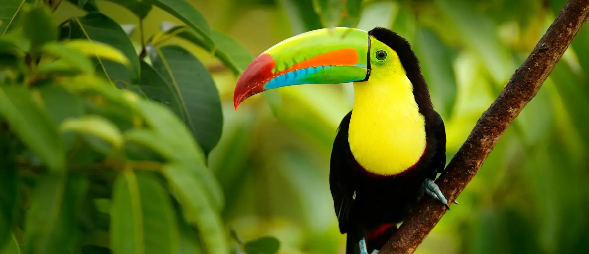 This is the Keel-Billed Toucan, a symbol of the region's biodiversity. Its resplendent plumage and magnificent bill are like strokes of exotic brilliance against the lush green of the rainforest.