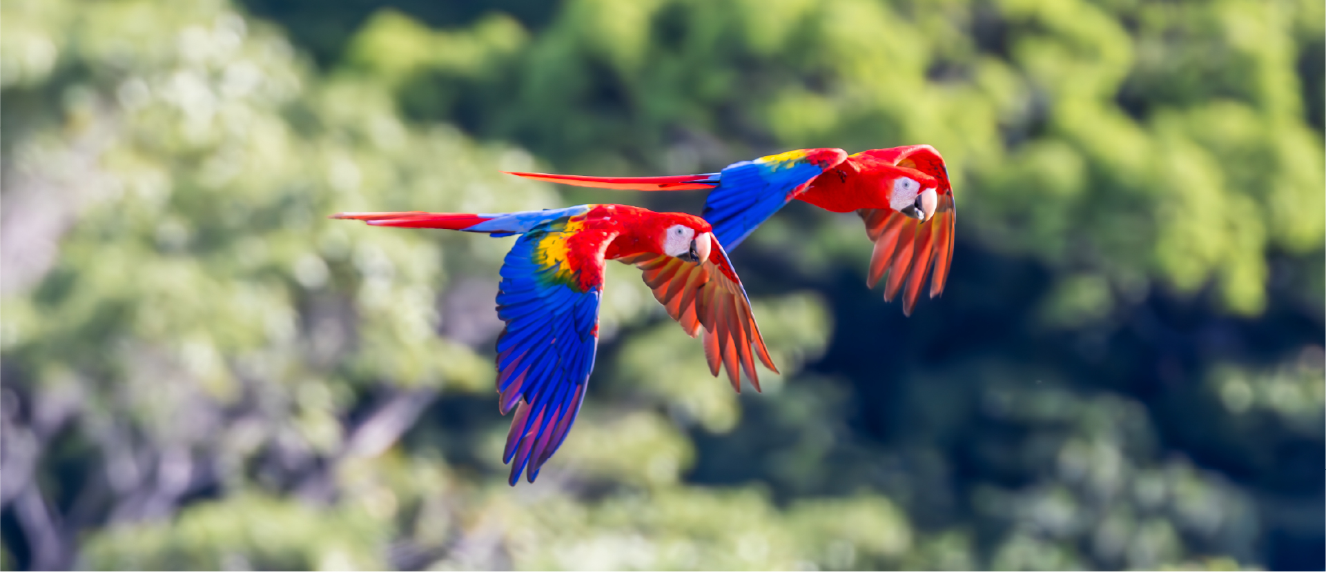 A stunning bird with vibrant plumage that lights up the lush rainforests. These majestic creatures, with their brilliant red, blue, and yellow feathers, add a splash of color to the canopy.