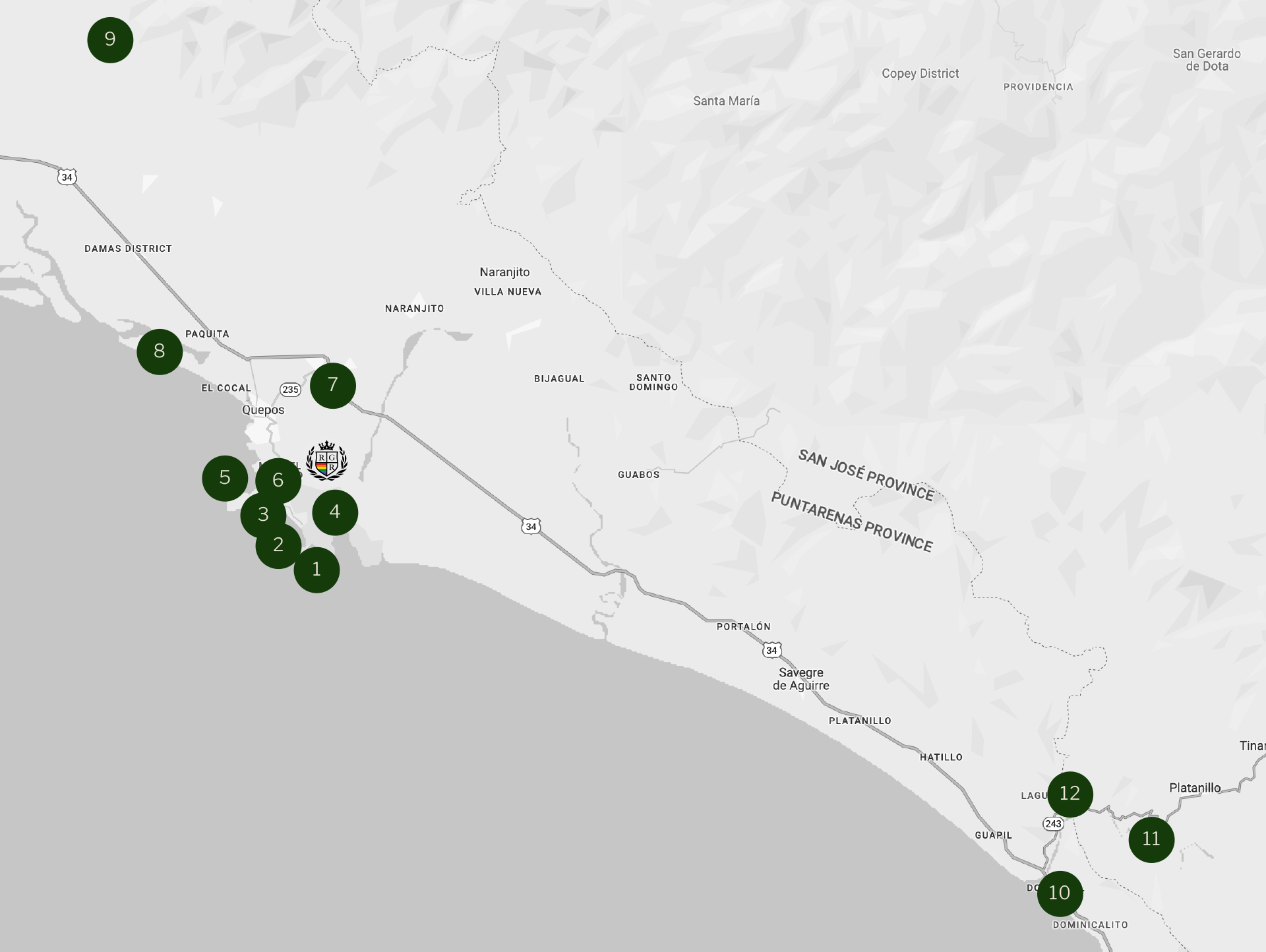 (9.4090° N, 84.1610° W): Located slightly further from the main hotel areas, a short drive is necessary.